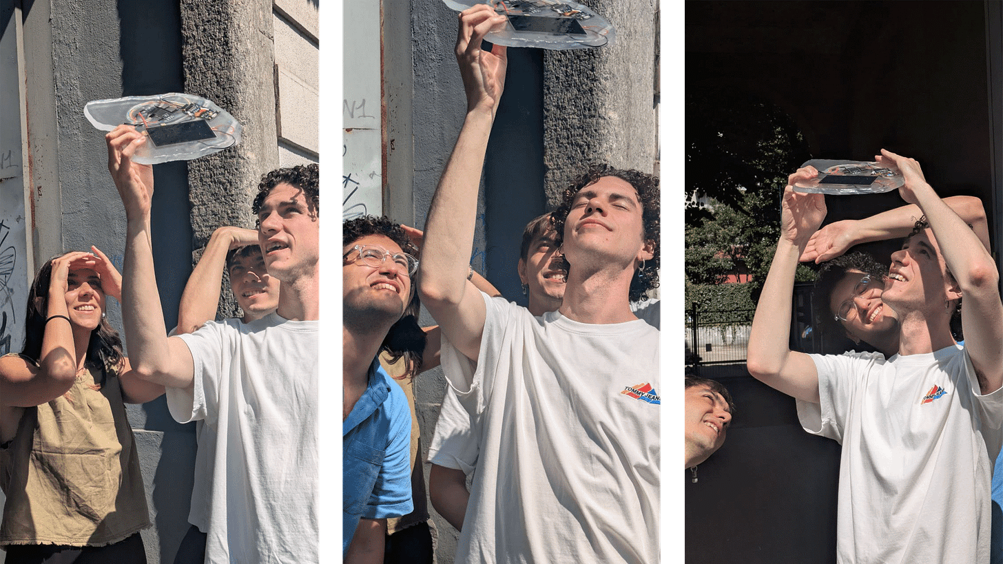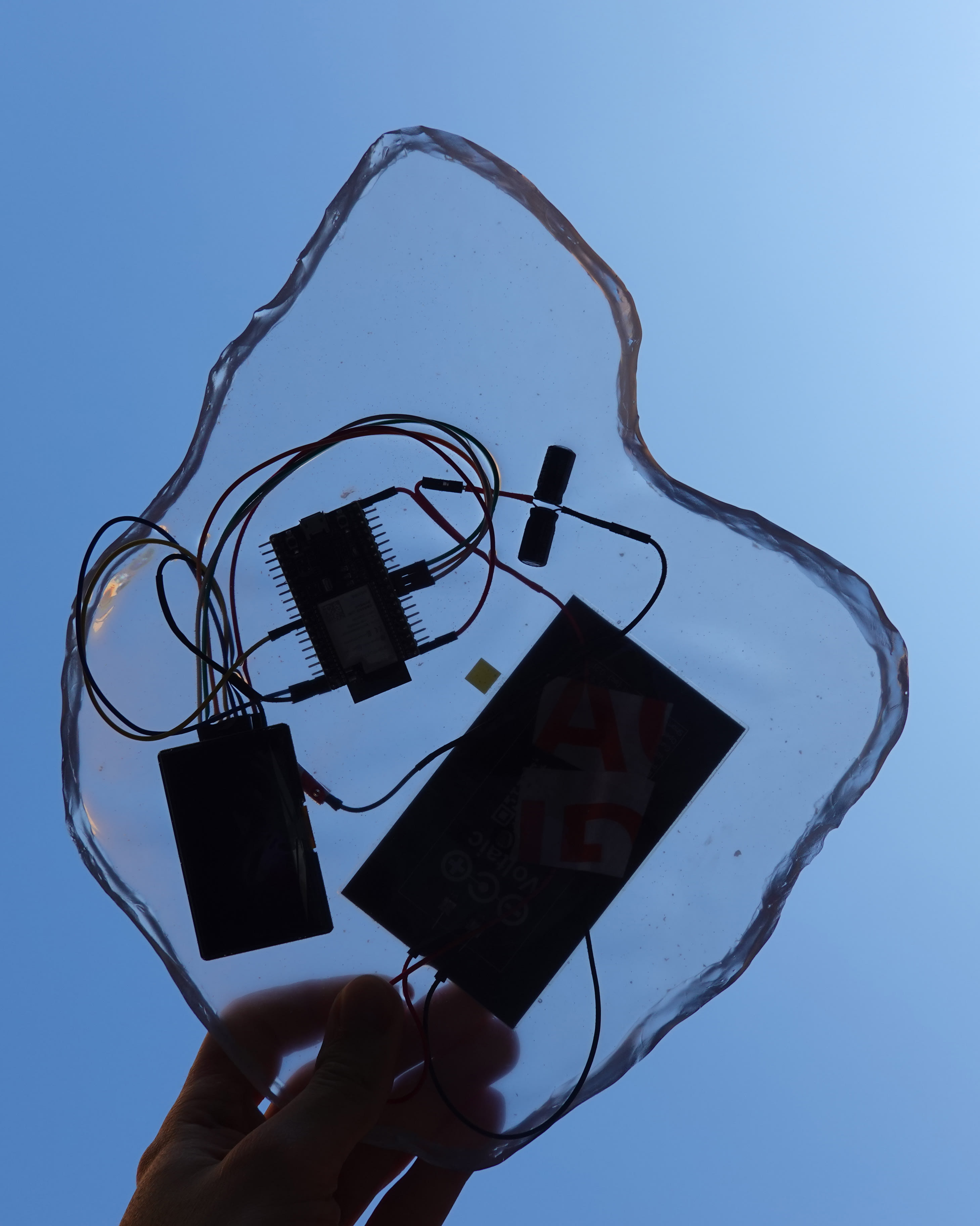 At this stage, the prototype ran on an ESP32 WROVER with a small OLED display. The next question was how to power it. Early ideas included a hand crank or even a hydroelectric turbine attached to a sink—solutions that were clever but felt theatrical, too bound to human muscle and infrastructure. We wanted the device to live by its own rhythm, to draw from the same source that has fed every new organism, every new circuit, every photosynthetic process since the beginning: sunlight. To let the machine depend on it was to acknowledge a common condition. In this sense, the act of raising the device toward the sun was not symbolic but ontological—a small ritual of dependency, aligning the machine’s metabolism with that of the planet.