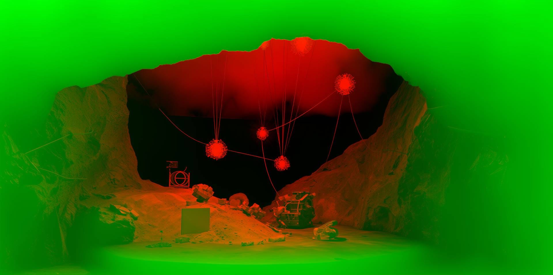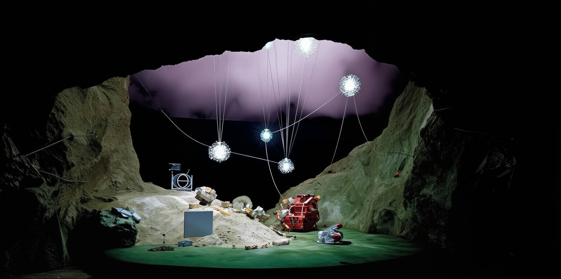 To avoid the ready-made finitude of AI generation, and in keeping with the camera obscura comparison, we departed from prompting as a singular act and instead treated it as the foundation for an iterative process. The resulting images occupy an ambiguous position between fabrication and plausibility. The viewer is aware that what they are looking at has been assembled, lit, and arranged, even as it retains a degree of material credibility. Rather than attempting to visualize abstract futures, the images condense elements of the research into spatial situations, allowing concepts such as infrastructure, extraction, and computation to manifest as physical presences or props.